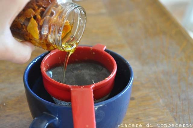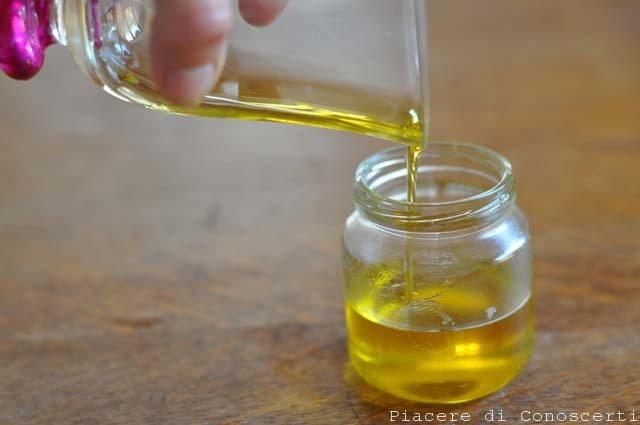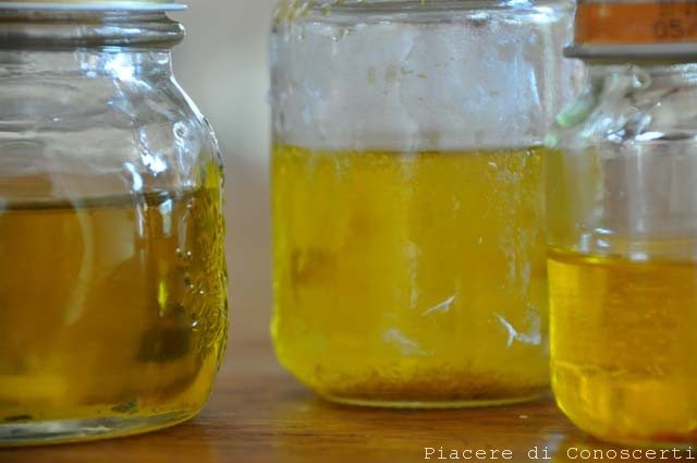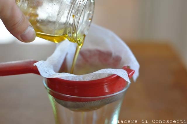 Dopo aver riposato in un luogo buio e asciutto prendiamo i nostri vasetti di vetro e aiutandoci con un passino a trama fitta eseguiamo i due filtraggi necessari per ultimare la produzione dell’oleolito.