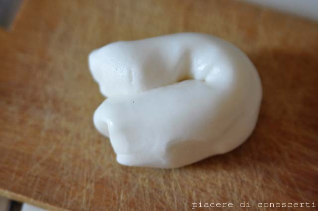 Mescolare gli ingredienti e lavorare con le mani, far riposare in frigorifero per una mezz’ora prima di manipolare…non fatela in piena estate perchè “teme il caldo eccessivo“!