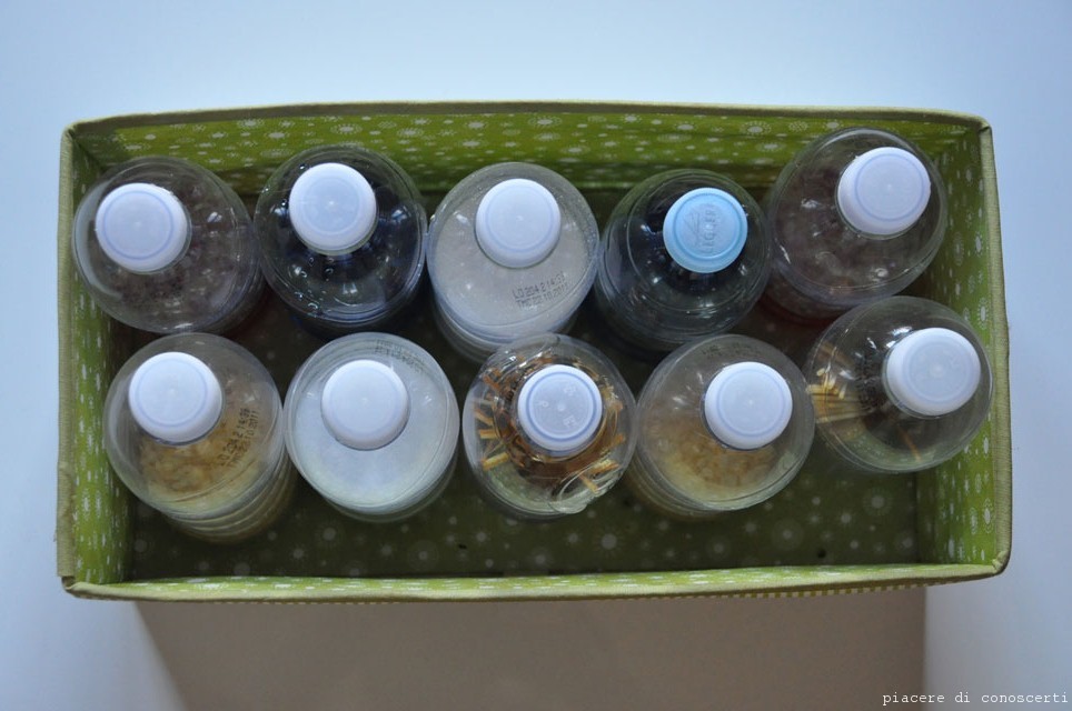 Servono delle bottiglie da mezzo litro di plastica bene asciutte e un pò di fantasia per quanto riguarda ciò che metteremo dentro, io per esempio ho messo: