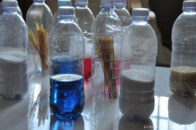 Quando Annalisa ha iniziato a maneggiare bene gli oggetti le ho realizzato con delle bottigliette di plastica uno di quei giochi che benedici perchè risolve moltissime situazioni in cui non sai cosa far fare al tuo bambino, con questo semplice gioco ci passiamo dei quarti d’ora preziosissimi per la mamma che magari deve preparare la cena…