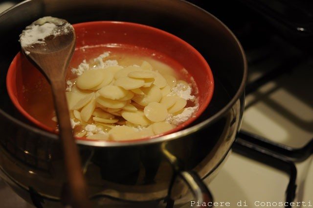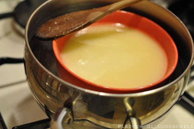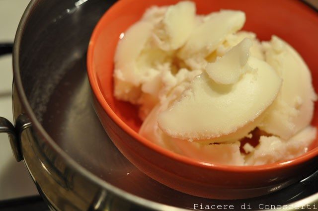 Mettiamo a sciogliere a bagno maria il karitè, il burro di cacao, il bicarbonato e la maizena.
