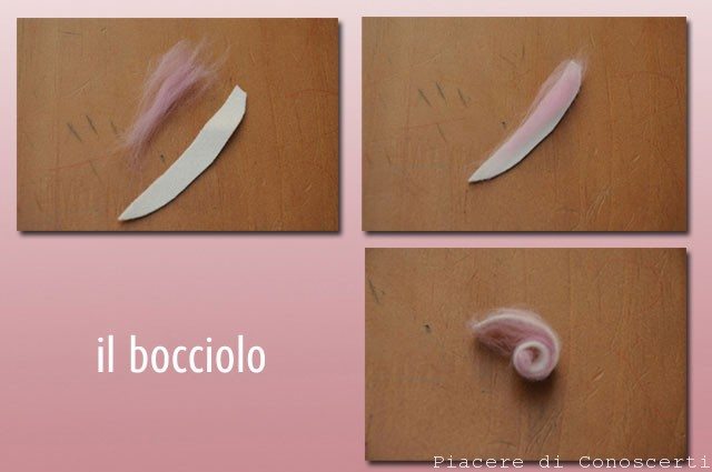 Oltre i fiori ho realizzato un piccolo bocciolo in un modo semplicissimo, una striscia di feltro arrotolata su se stessa con un pò di lana rosa all’interno e poi fermata con qualche puntino alla base.