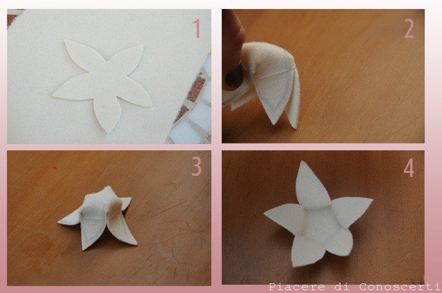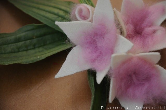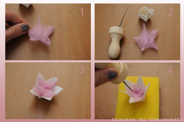 Prendere un pò di lana cardata e fare in modo, passandola tra le dita, di creare cinque punte che poi saranno fatte coincidere ognuna con un petalo. Con l’ago per infeltrire picchiettare al centro del fiore per fissare la lana all’interno.