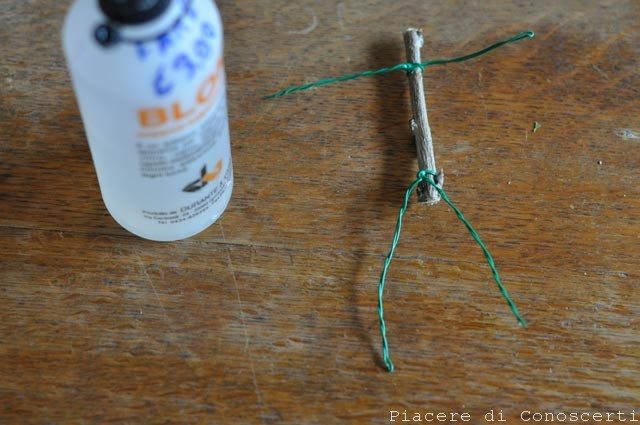Avvolgiamo due parti di fil di ferro intorno al bastoncino per formare le braccia e le gambe, fermiamo in modo che le braccia possano sfilarsi.