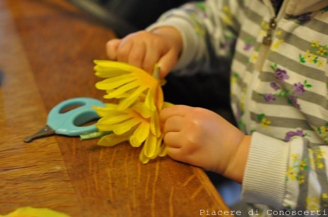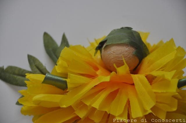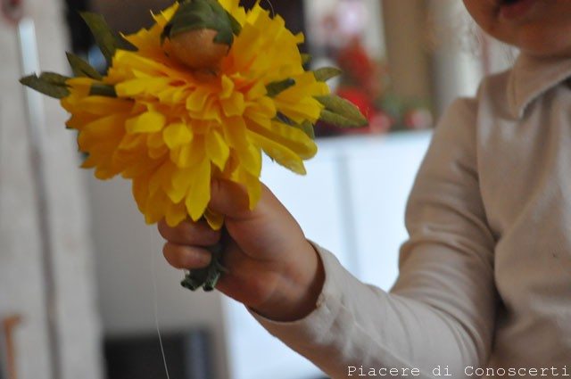 Togliamo dai fiori artificiali il picciolo di plastica e avremo così vari strati di petali. Infiliamo nel bastoncino i petali del fiore più grande tra le gambe e le braccia, poi mettiamo il fil di ferro che rappresenta le braccia e fissiamo con la colla, nell’ultimo tratto di bastoncino prima della testa infiliamo i petali del fiore più piccolo e poi fissiamo la pallina di legno.