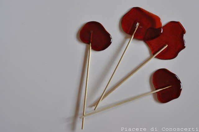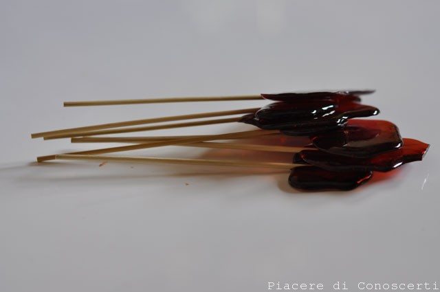 Intanto tagliate la punta ai bastoncini da spiedino e appoggiateli su ogni cerchietto(attenzione il caramello che abbiamo creato scotta in modo incredibile). Dopo qualche minuto spingete ancora i bastoncini per farli attaccare meglio. Lasciate ancora un pò raffreddare e dare ai vostri bambini che vi ringrazieranno con un grande sorriso!![]()