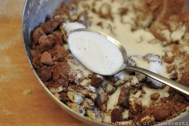 Il procedimento è semplice perchè si sgretolano i biscotti e si aggiunge tutto il resto, il latte ovviamente per ultimo in modo che riusciamo a vedere quanto ce ne serve man mano che lo mettiamo.