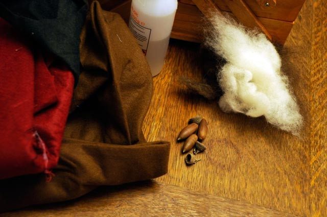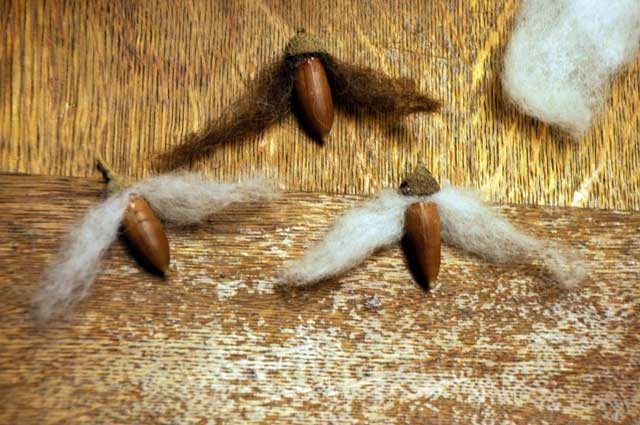Ora dobbiamo staccare il cappellino dal sotto della ghianda e incollarci in mezzo un pò di lana cardata del colore che più ci piace per poi riattaccare il cappellino.