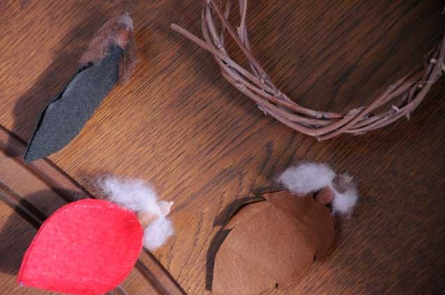 Per comporre la fogliolina basta incollare insieme le due foglie di pannolenci mettendo in mezzo la base della ghianda a formare la testolina.