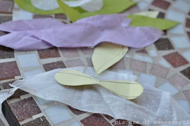 La prima cosa da fare è ritagliare dei pezzi di stoffa o di cartone a forma di ali di libellula, una più grande e una più piccola