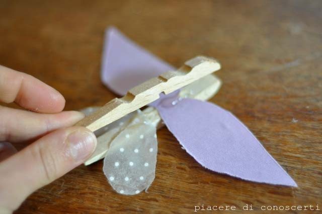 Poi bisogna aprire una molletta per il bucato di legno e rovesciarla “schiena contro schiena” in mezzo mettiamo i due pezzi di stoffa e il filo da pesca, incolliamo e lasciamo asciugare.