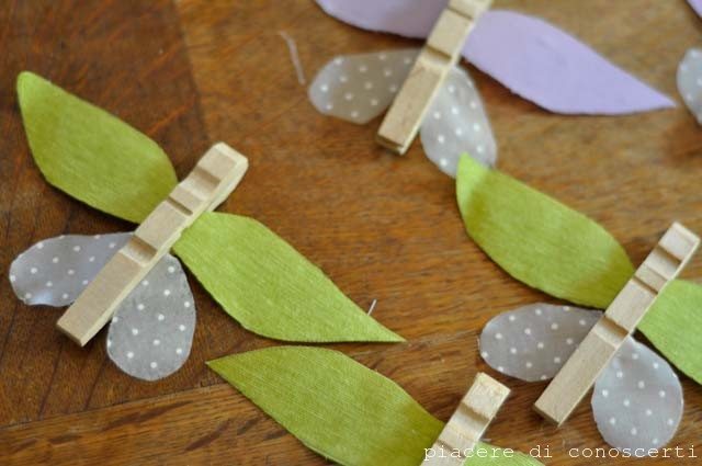 Ora bisogna attaccarle ad un supporto, io ho sempre le mie coroncine fatte con i rami del glicine, ma voi potete usare anche un’asta di legno lineare attaccando le libellule in fila, l’una dopo l’altra.