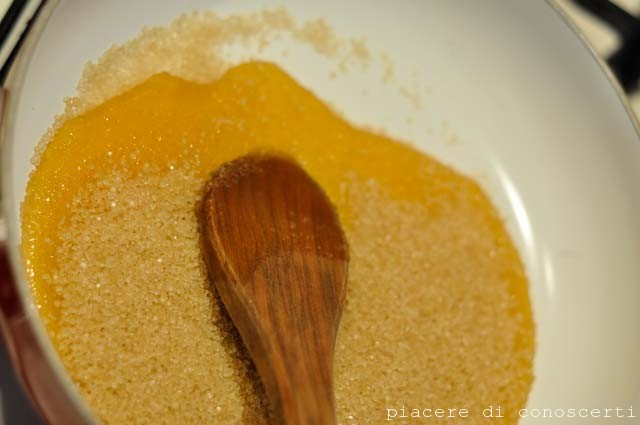Mettiamo in una padellina il miele e lo zucchero e facciamo sciogliere il tutto sul fornello con il fuoco molto basso, mescolando continuamente fino a raggiungere il bollore