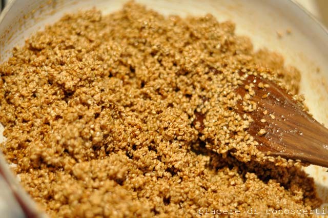 Aggiungiamo i semi di sesamo e facciamo cuocere sempre girando spesso, per 15-20 minuti, noterete che il composto prenderà un colore dorato