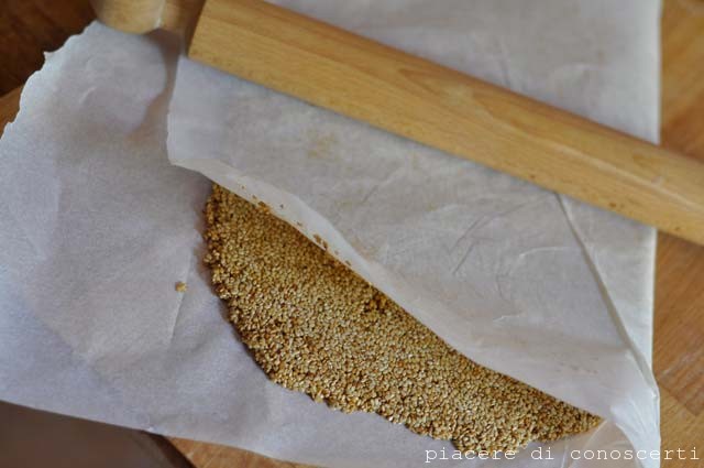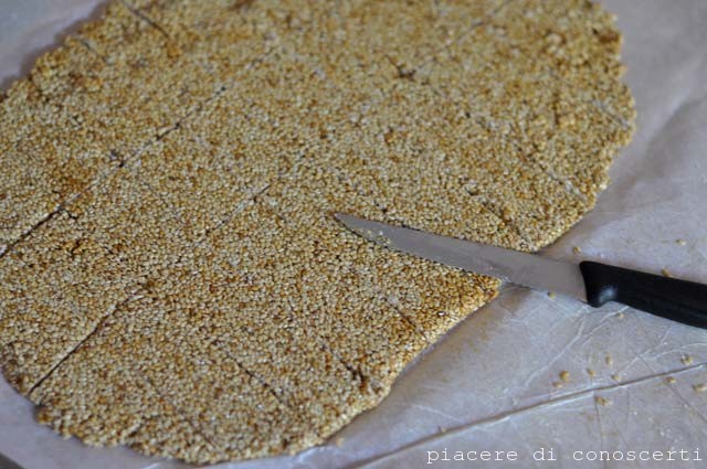 Una volta steso tagliamo in barrette, il taglio può anche non arrivare al fondo ma essere superficiale tanto poi la lastra di sesamo si spezzerà di netto lì dove siamo passati col coltello.